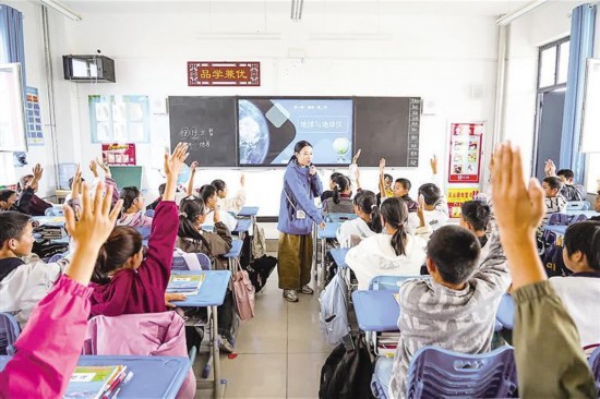 林楚韓在講授地球與地球儀相關知識,學生們踴躍舉手,積極回應老師的提問。