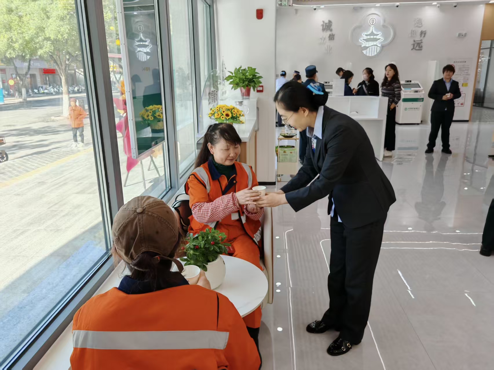該行精心打造的“工會驛站”茶歇專區,已成為戶外勞動者的溫馨港灣。快遞員、環衛工人、出租車司機等群體可在此免費飲水、充電休憩,緩解工作疲憊。驛站還借助智能電子屏循環播放金融知識短視頻,工作人員現場講解防詐騙、存款保險等內容,幫助戶外勞動者增強金融風險防范意識,實現“歇腳充電”與“知識充電”兩不誤。在靈武支行營業部煥新開業之際,網點特邀十余位環衛工人走進網點參觀體驗。環衛工人王女士感慨道:“原來只是好奇看看,沒想到農行不僅環境舒適,還專門為我們設置了休息區,想得太周到了。”
