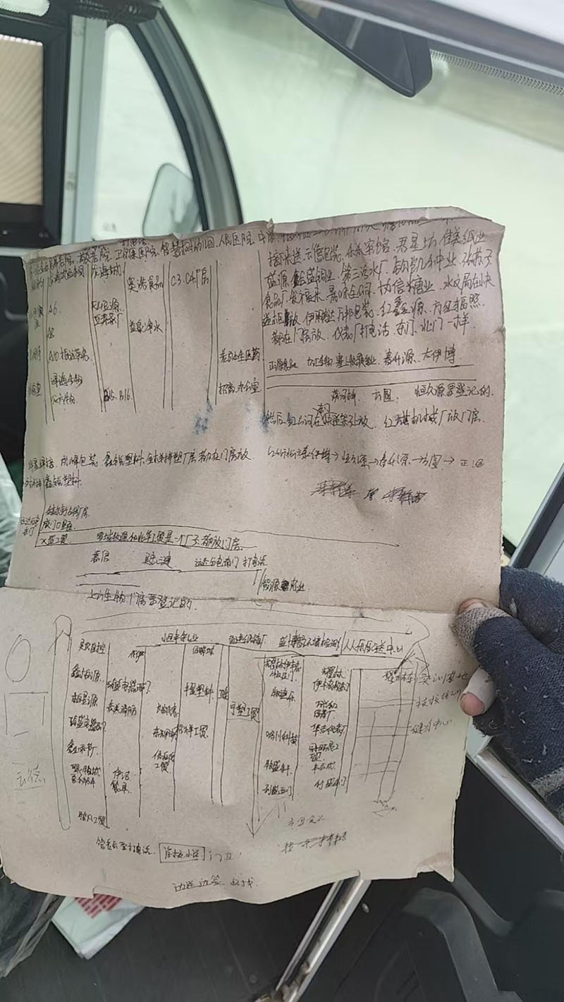 “那時候送貨全靠嘴問,有時候問錯路繞半天,快件送晚了還得跟客戶道歉。”朱靜濤說。為了不耽誤送貨,他想了一個辦法——手繪地圖。