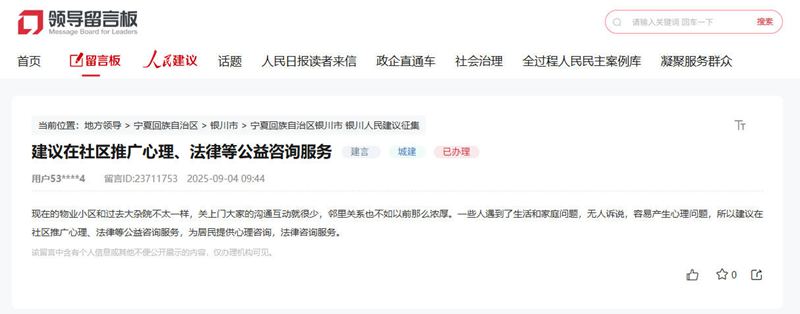 人民网银川11月2日电 (记者穆国虎)近日,有网友在人民网“领导留言板”上留言,建议宁夏银川市在社区推广心理、法律等公益咨询服务,优化社区服务与关爱重点群体。