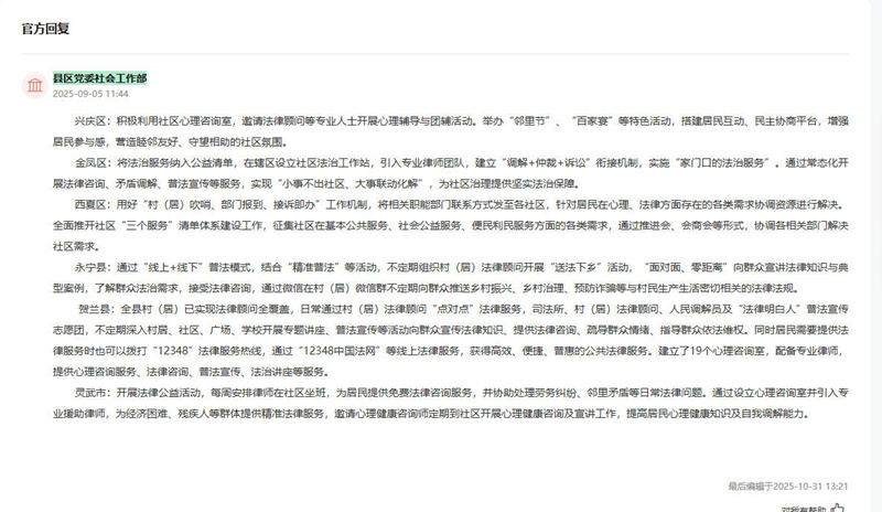 贺兰县回复称,全县村(居)已实现法律顾问全覆盖,日常通过村(居)法律顾问“点对点”法律服务,司法所、村(居)法律顾问、人民调解员及“法律明白人”普法宣传志愿团,不定期深入村居、社区、广场、学校开展专题讲座、普法宣传等活动向群众宣传法律知识、提供法律咨询、疏导群众情绪、指导群众依法维权。同时居民需要提供法律服务时也可以拨打“12348”法律服务热线,通过“12348中国法网”等线上法律服务,获得高效、便捷、普惠的公共法律服务。建立了19个心理咨询室,配备专业律师,提供心理咨询服务、法律咨询、普法宣传、法治讲座等服务。