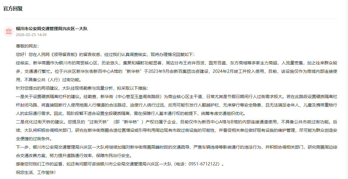 针对此留言,银川市公安局交通管理局兴庆区一大队作出公开回复:经核实,新华商圈作为银川市的商贸核心区,历史悠久,集聚和辐射功能显著,周边分布王府井百货、国芳百盛、东方商城等多家主力商超,人流量密集,加之往来群众较多,交通通行繁忙。